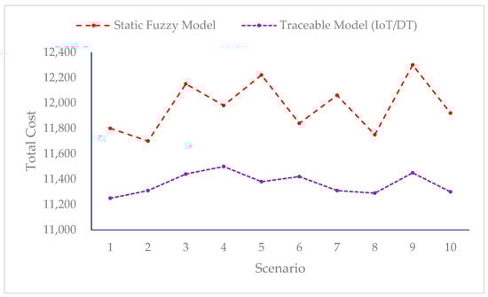 To accurately assess the impact of real-time traceability based on IoT and digital twin architecture, a comparative analysis was designed between two models: (1) a static fuzzy model with predefined parameters and (2) a dynamic model with parameters updated based on real-time data. Figure 12 shows the difference in total cost in ten numerical scenarios with different problem sizes. In all scenarios, the traceable model was able to lead to more optimal and less costly decisions, indicating a better performance in adapting to environmental changes.