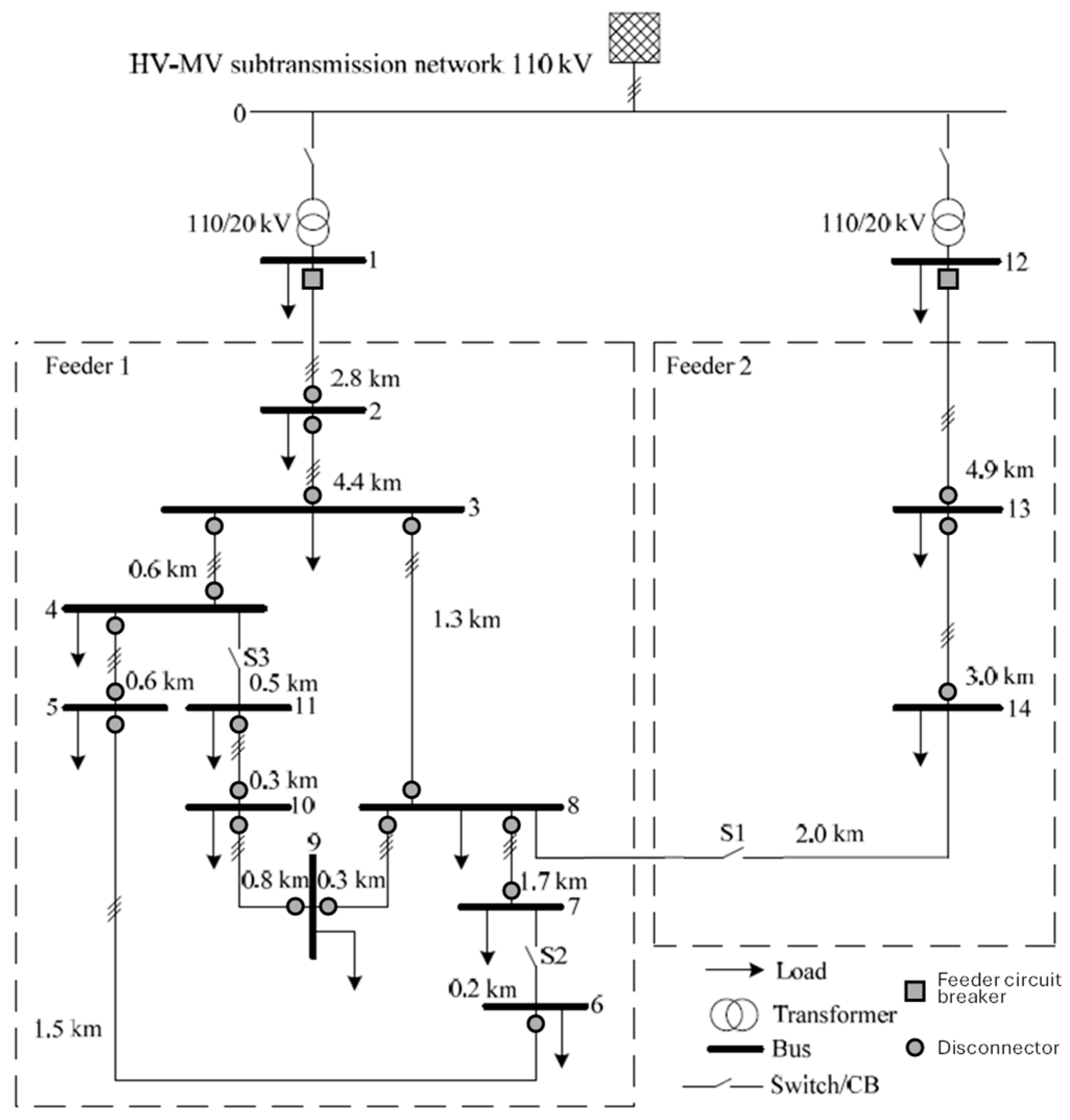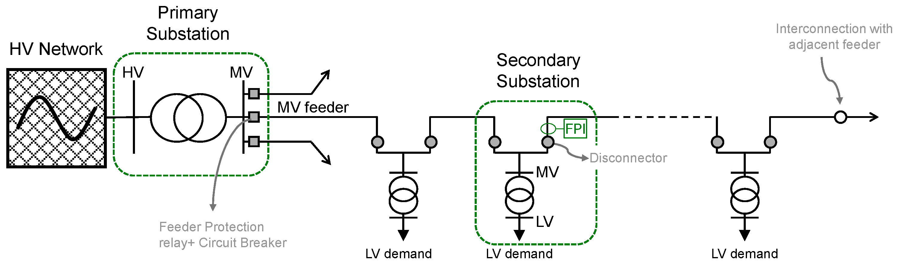 Figure 2 presents a simplified single-line diagram of a distribution feeder that conceptually illustrates the principal components discussed in the preceding procedures, including the primary and secondary substations, protection relays with their associated circuit breakers, sectionalising switches or disconnectors, and FPIs.