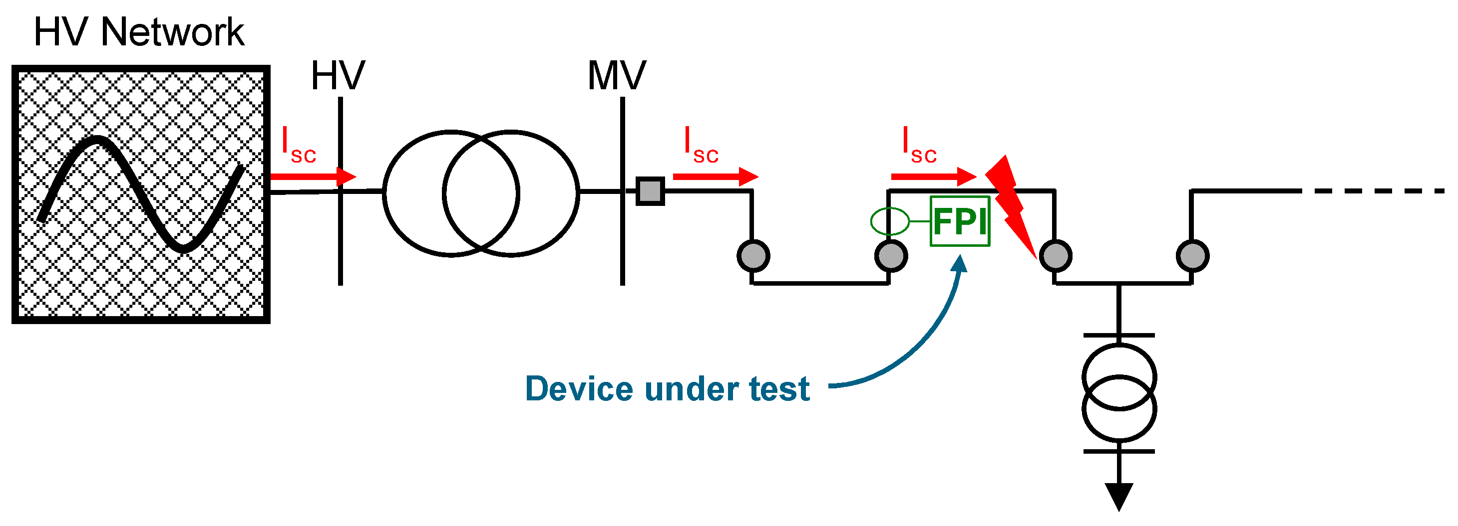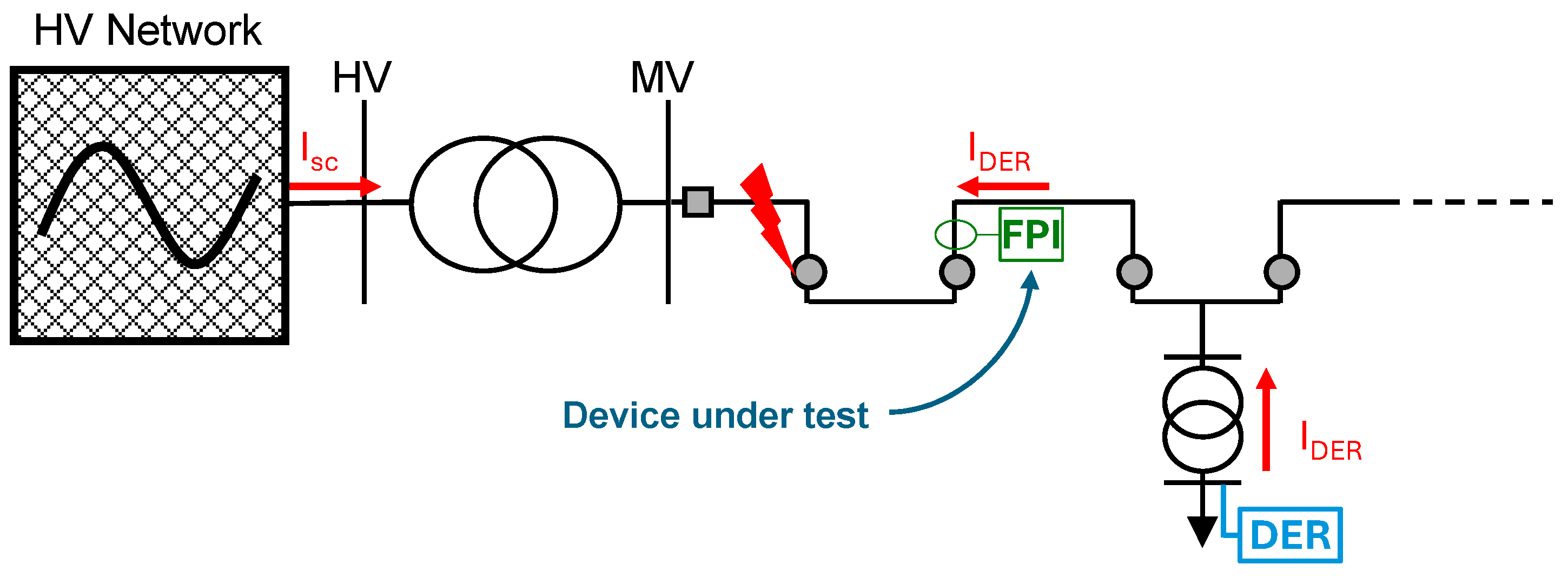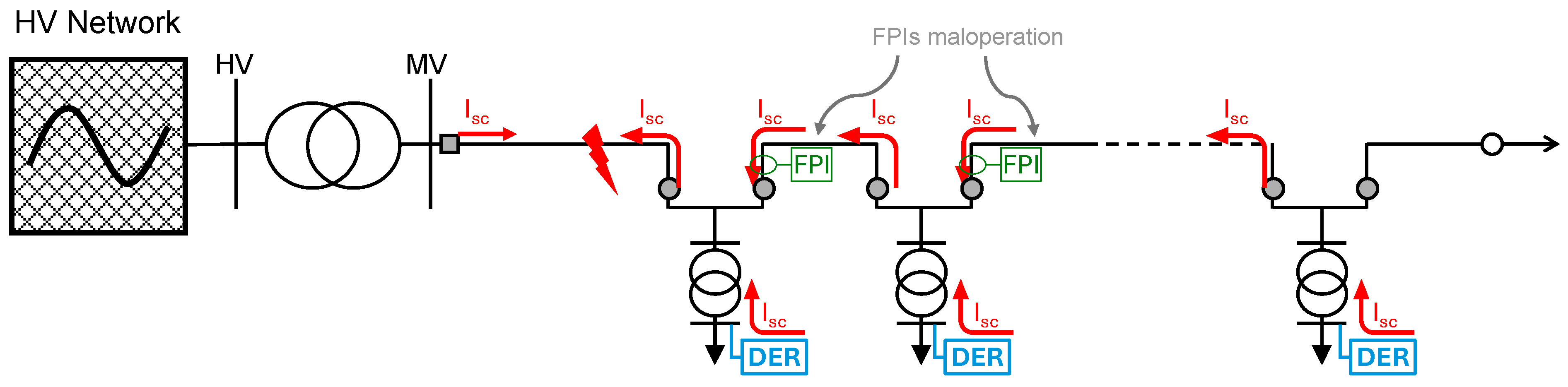 The scheme presents the effect of fault contributions from the HV network and DER units (represented by I