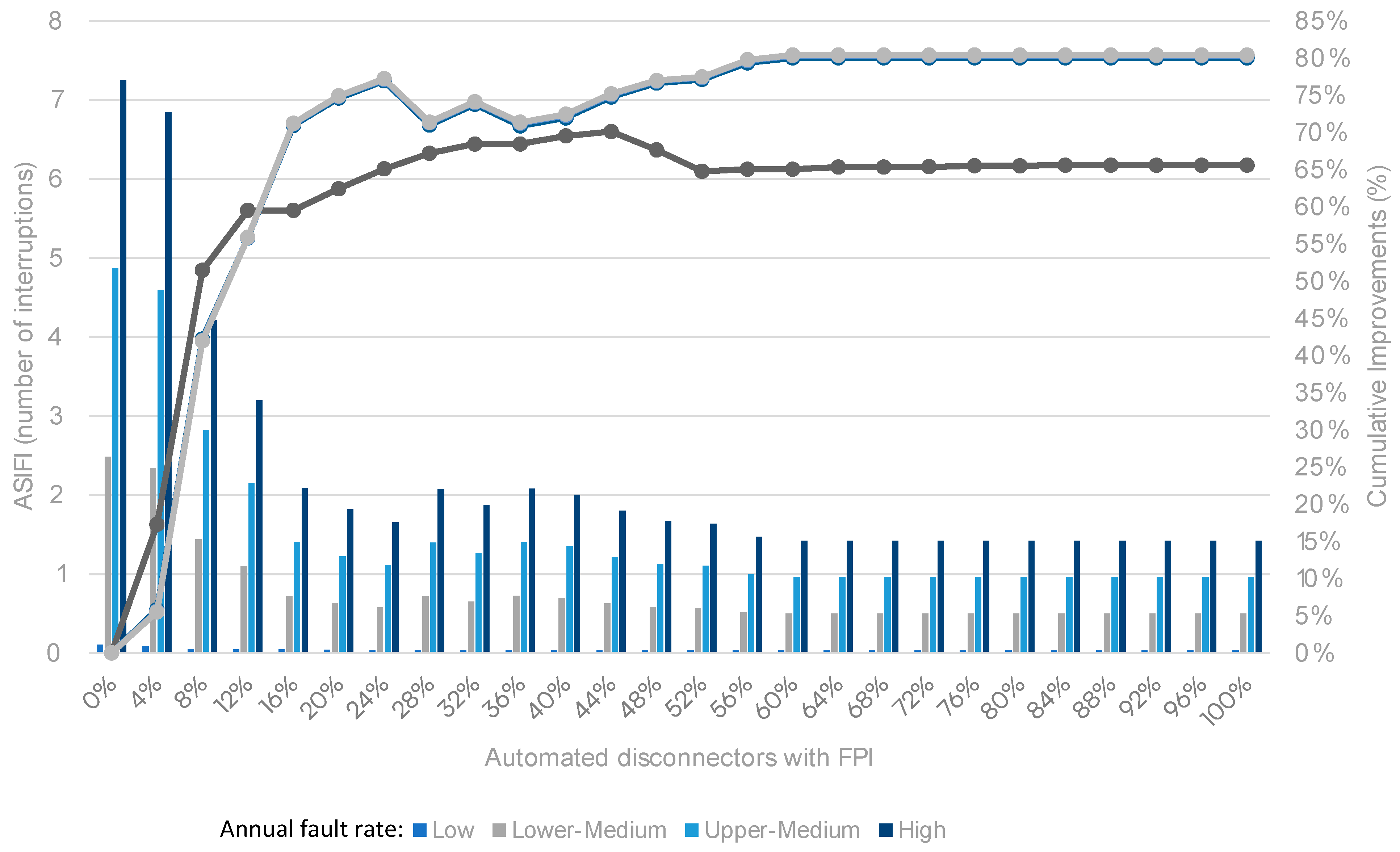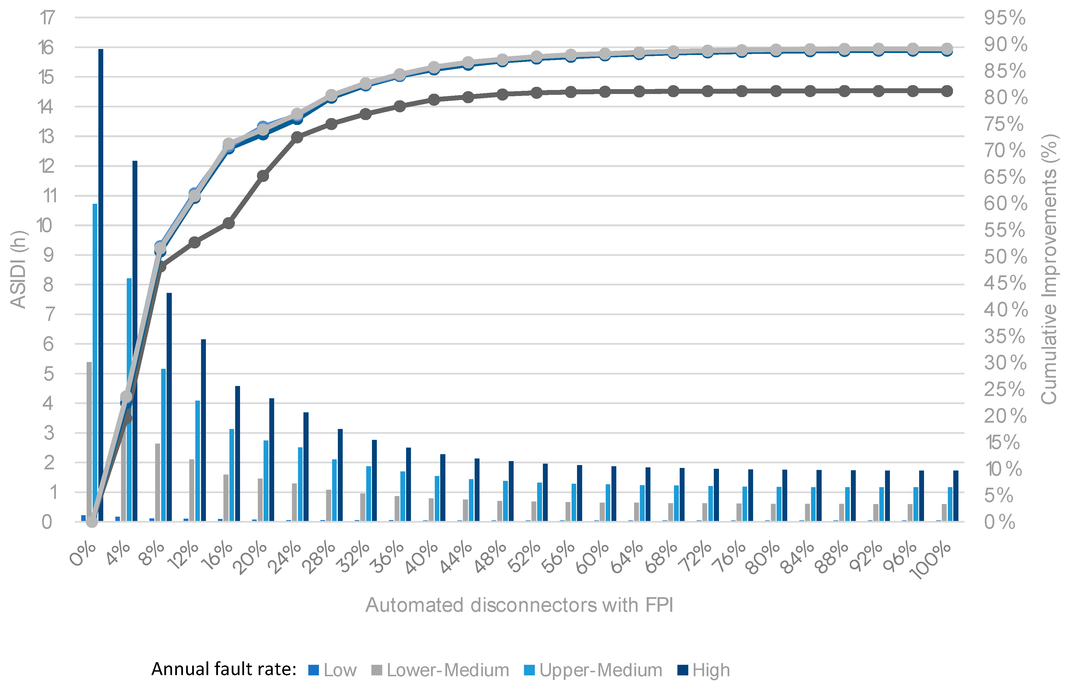 As observed, taking as an example the high fault rates, ASIDI can improve significantly, falling from nearly 16 h/year for manual operation to less than 1.73 h/year in fully automated FLISR, with a cumulative improvement of 89% (