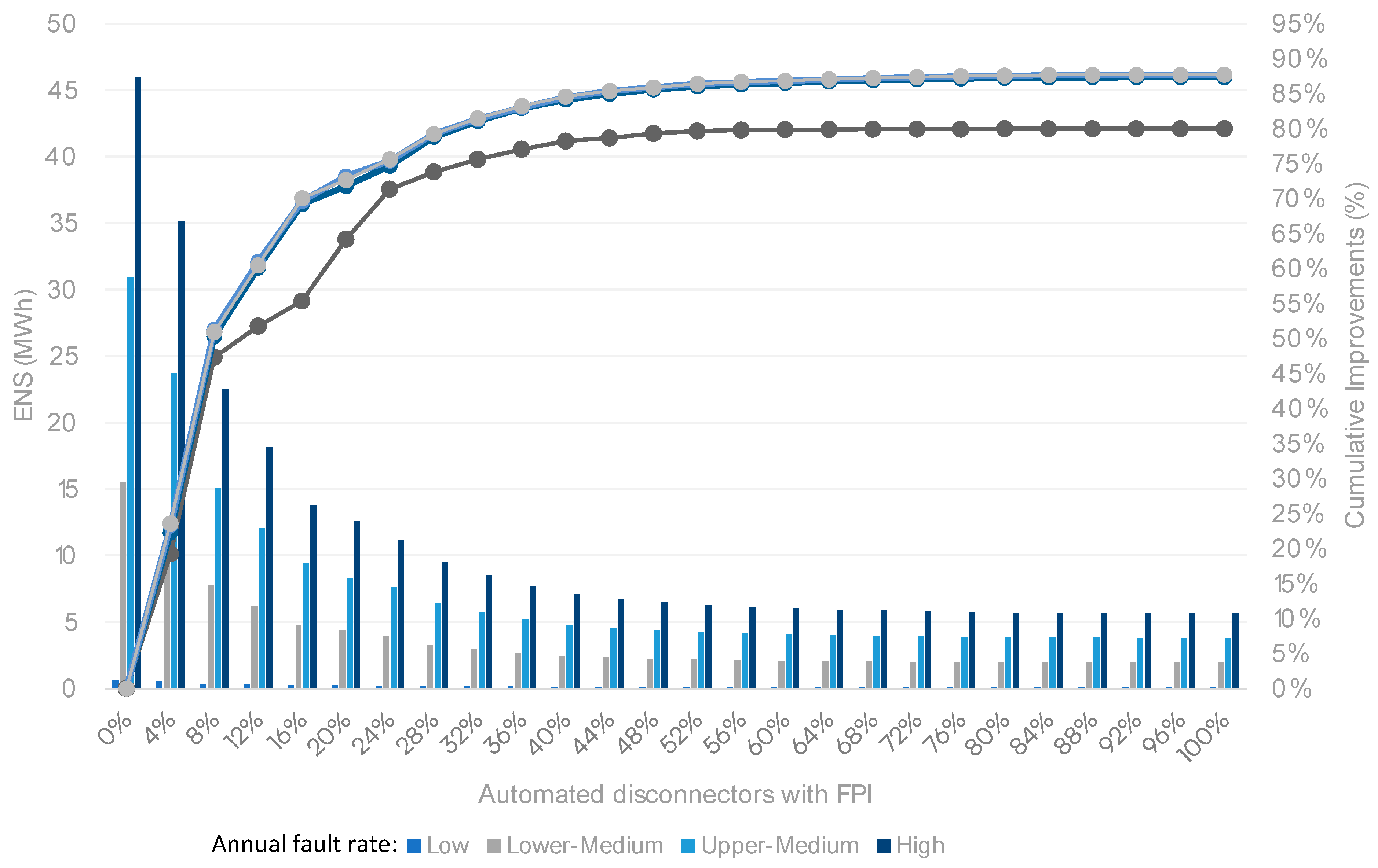 Figure 14 illustrate the evolution of ASIDI, ASIFI, and ENS values, respectively, with the level of penetration of automated disconnectors in the MV network (considering optimised placement of automated disconnectors). KPI values are represented by bars, and cumulative improvements by curves.