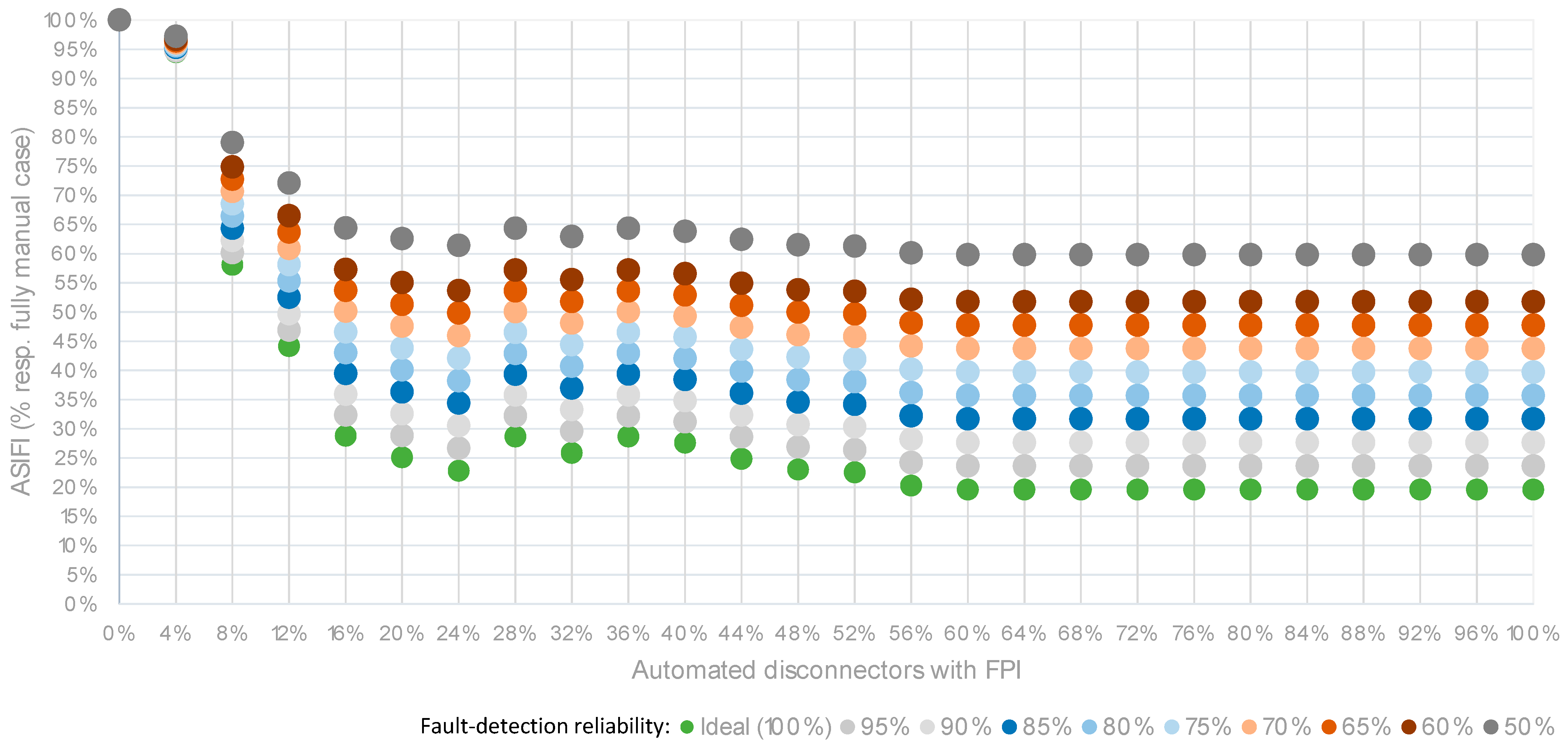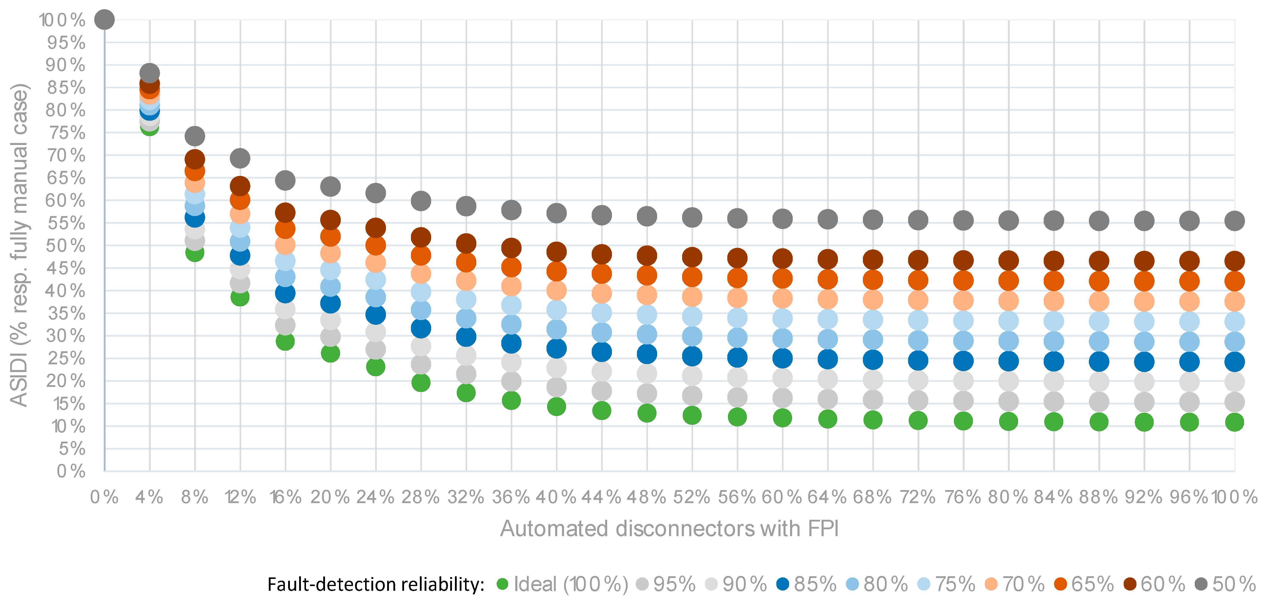 Figure 17 illustrate the results obtained for ASIDI, ASIFI, and ENS, respectively, for the different levels of automation considered, expressed in relative terms with respect to the baseline manual case, and incorporating the results for a range of reliability values of fault-detection systems (for clarity, only values for the high annual fault rate are included). The graphics, which complement