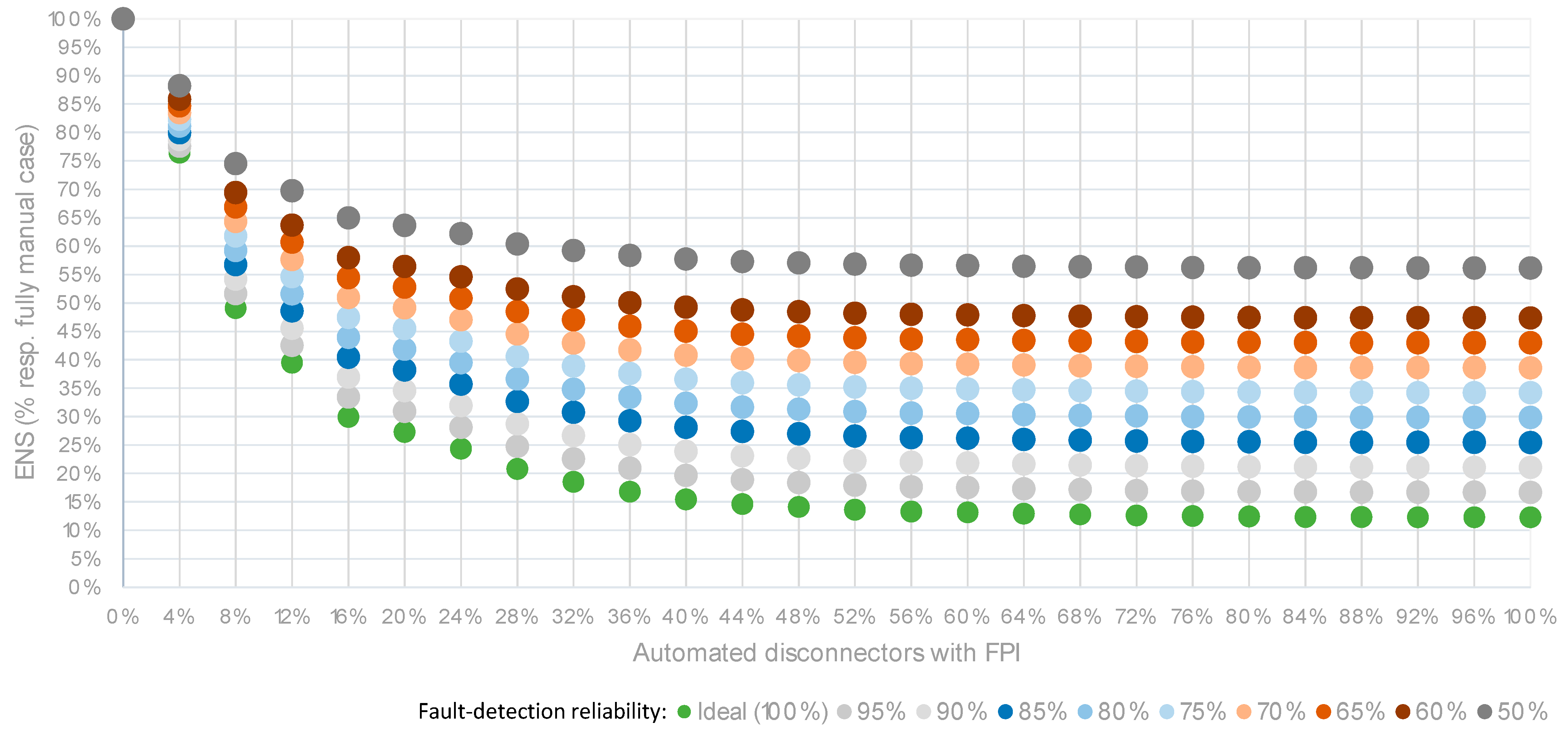 Figure 12 even a modest penetration of optimally located automated disconnectors (30–40%) leads to significant improvements in ASIDI values over the manual case, while automation levels of about 60–80% allow achieving performance close to that of fully automated scenarios. A similar trend is observed for ENS (