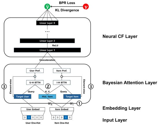As discussed in Section 2.2, implicit feedback data do not always accurately reflect a user’s true preferences. In other words, such data inherently contain ambiguity in user preference signals. Unlike the previous studies introduced in Section 2.3, this study assumes that observed user–item interactions contain uncertainty and proposes a Bayesian framework-based method that models this uncertainty. In particular, we propose the Bayesian attentional collaborative filtering (BACF) model, which integrates components of the BAM with elements from the NeuMF architecture [] to optimize personalized ranking. The overall structure of the proposed model is shown in Figure 1.