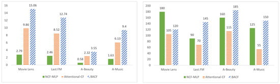 This study was conducted using an Nvidia GeForce RTX 4060 Ti GPU. Figure 2 illustrates the time required per epoch and the number of epochs until convergence for three models across each dataset: the MLP module of NCF, Attentive-CF (which replaces the Bayesian attention module in BACF with a standard attention module), and the proposed BACF model. While the BACF model consistently outperforms the others in terms of recommendation accuracy, it requires substantially longer training time. This indicates a need for further optimization to improve the model’s training efficiency.