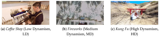 To address the two research questions of our study, three 360-degree videos of varying AV dynamism were selected, ranging from low to high, as proposed by [32]. The LD (Figure 1a) shows the process of making coffee, accompanied by dubbed background sounds. Considering the straightforward audio context, we expected that viewers would be less likely to notice AV skews in this video. At the opposite end of the spectrum, the HD video (Figure 1c) features a sequence of fight scenes in First-Person View (FPV) requiring meticulous AV synchronization to align sound effects with visual movements on the screen. We anticipated that any AV misalignment in this clip would be easily noticeable to participants. In the middle is the MD video (Figure 1b), which contains the spectacle of a fireworks show. Given that the scene is set against a night sky, punctuated by the display of fireworks and their accompanying sounds, this video’s dynamism is situated between the two mentioned scenarios. All videos were encoded at AAC (LC) (mp4a/0x6134706D), 48 KHz, stereo, fltp, 128 Kbps (default) and H.264 (high), and vp9.
