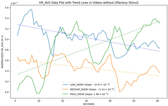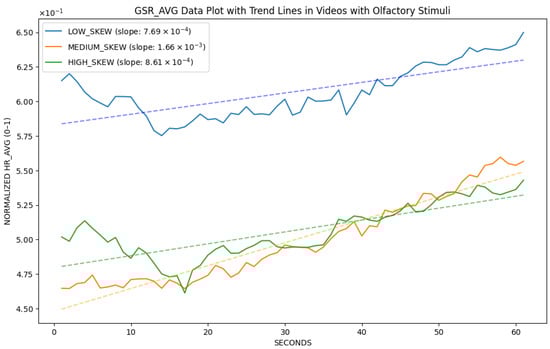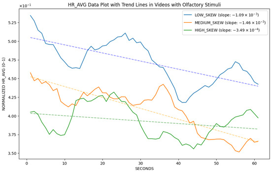 Figure 4. HR data collected from G 2 -Olfactory (participants with olfactory stimuli). Different colors represent various AV skew levels. LS is shown with blue lines, MS with orange lines, and HS with green lines. The straight lines indicate the slope calculated using simple linear regression. Within this normalized scale, the downward trends are modest in all skew levels. Medium skew exhibits the most pronounced decrease in HR over time, high skew is comparatively stable, and low skew shows an intermediate trend. This suggests that the AV skew level may modulate the trajectory of heart-rate responses during olfactory-augmented video viewing, with MS producing the strongest downward drift.