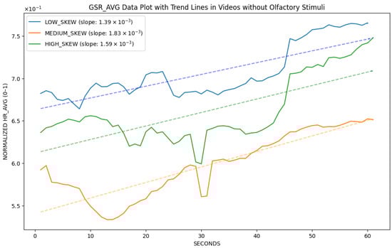 Contrary to the findings of the previous group, all groups exhibited a reduction in heart rate in this scenario (see Figure 4), which involved olfactory stimuli. However, a high degree of AV skewness resulted in a decreased slope compared to low and medium degrees of AV skewness. The GSR data mirrored those of the preceding group (see Figure 5); all groups showed a rise in values, with a comparable rate of change between the two groups.