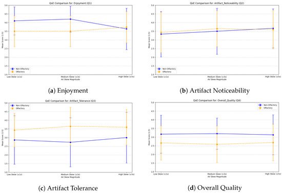 Figure 6. Subjective comparison of QoE metrics for the two groups ( G 1 -NonOlfactory/blue line and G 2 -Olfactory/orange line). Each panel shows mean ratings (error bars = SD) for the Low (LS), Medium (MS) and high (HS) AV skew buckets. (a) QoE-Q1 (enjoyment); (b) QoE-Q2 (artifact noticeability); (c) QoE-Q3 (artifact tolerance); and (d) QoE-Q4 (overall quality).