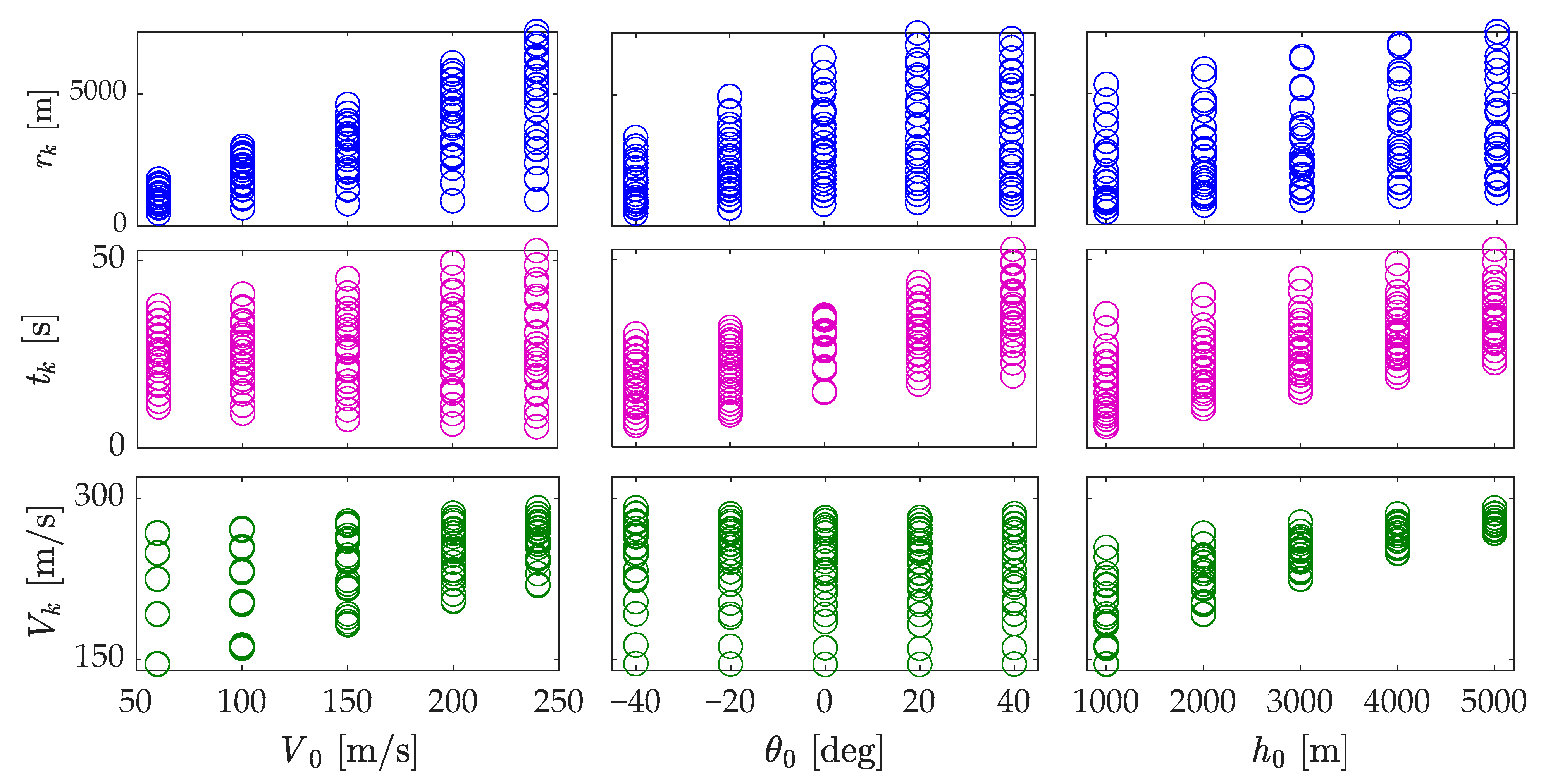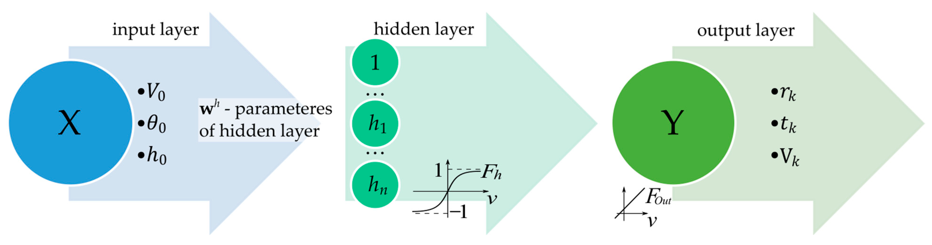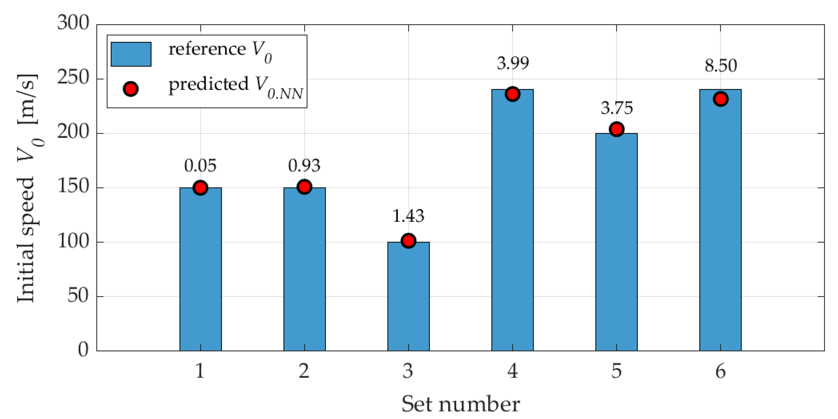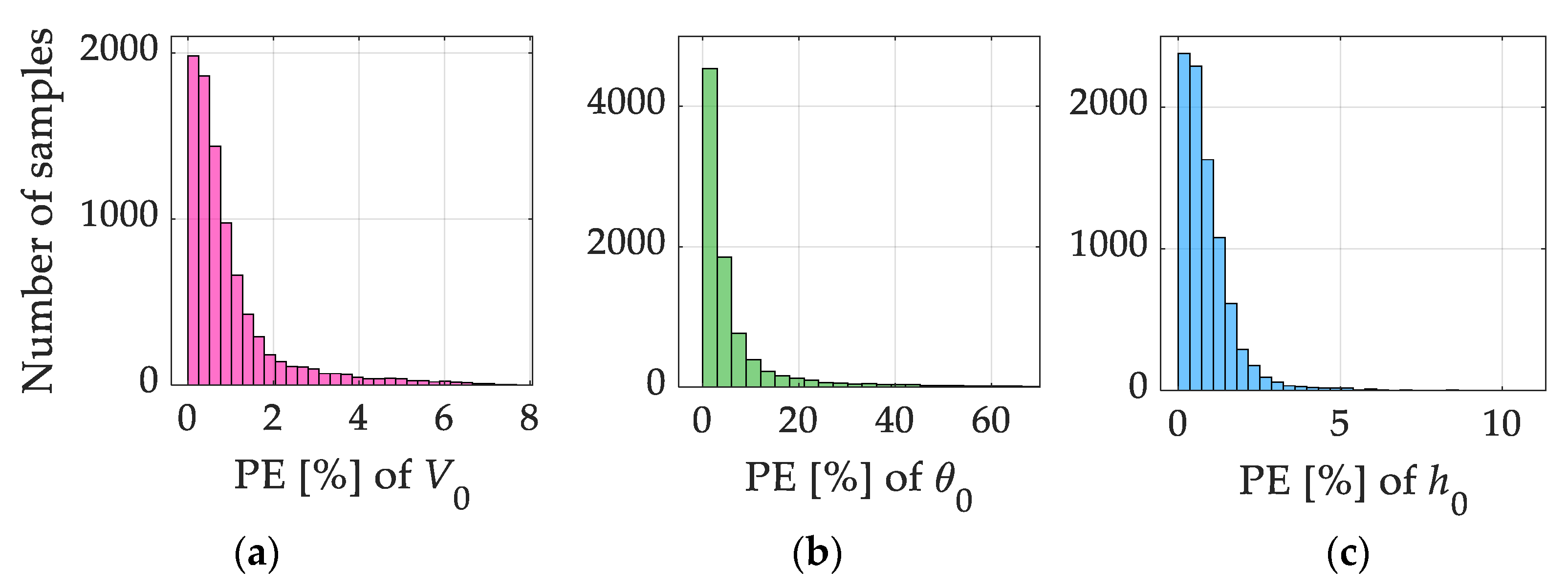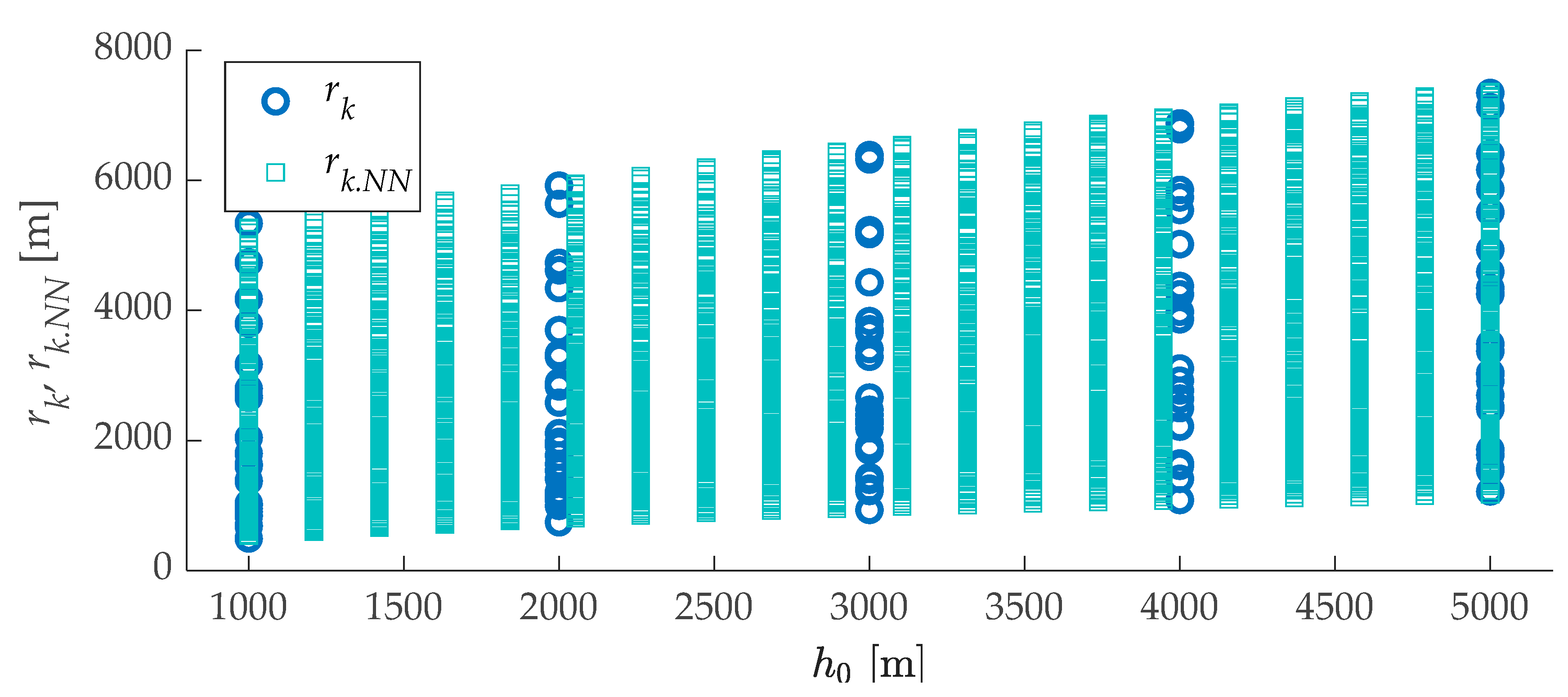- Case 1—deterministic verification: in this scenario, all input variables of the network (range, flight time, and final velocity) are taken from the reference dataset (Stage 1), and the outputs generated by NN2 (V0.NN, θ0.NN, h0.NN) are compared to the corresponding values from the reference set to assess their accuracy. The errors are calculated by comparing the original data (Stage 1) with the outputs of the neural network NN2.