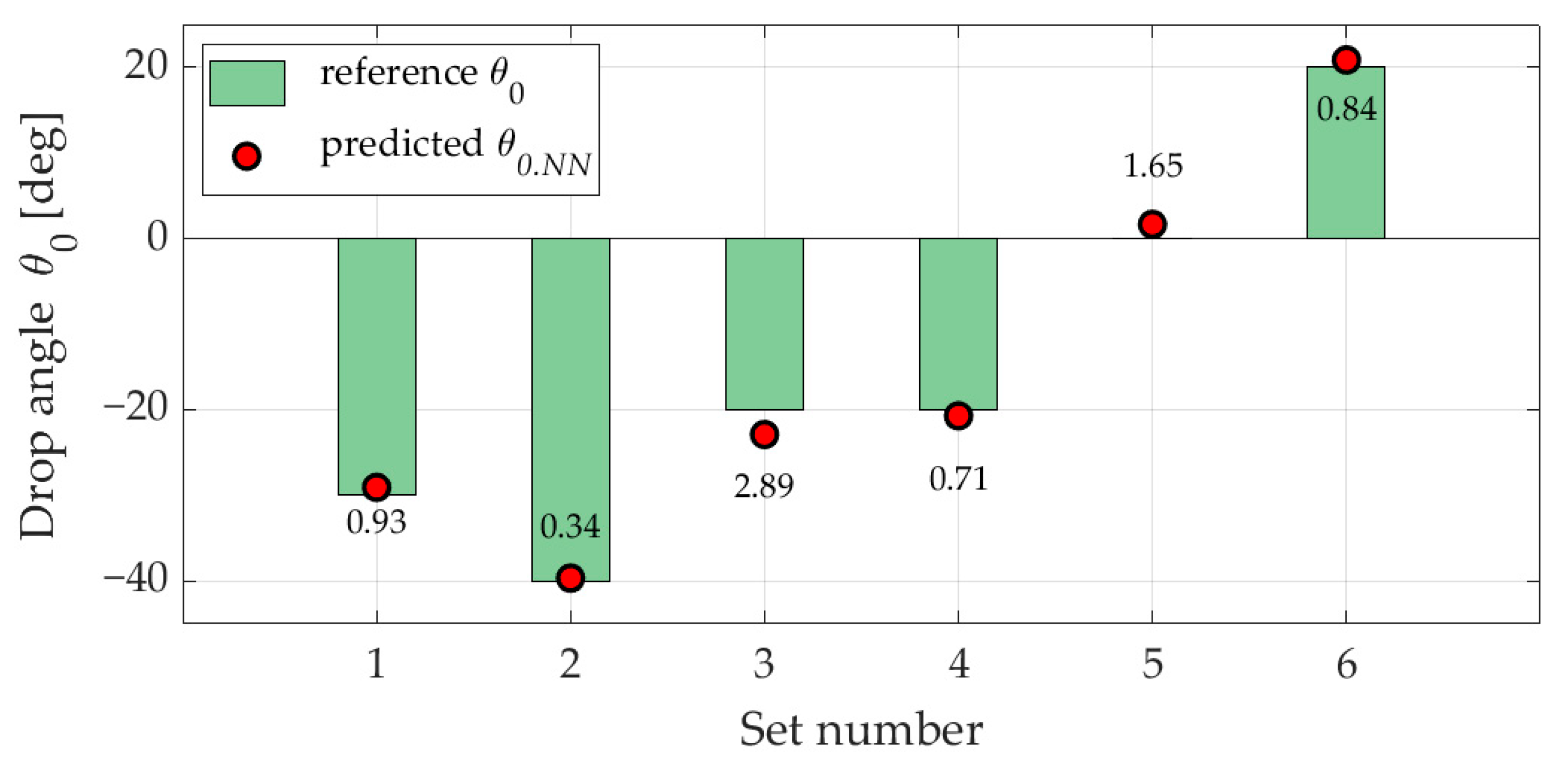 - Case 2—verification using random datasets: the input data for the network are sampled from predefined intervals based on a discrete uniform distribution. The results obtained from NN2 are verified by analyzing the final parameters after conducting simulations using the estimated initial conditions.