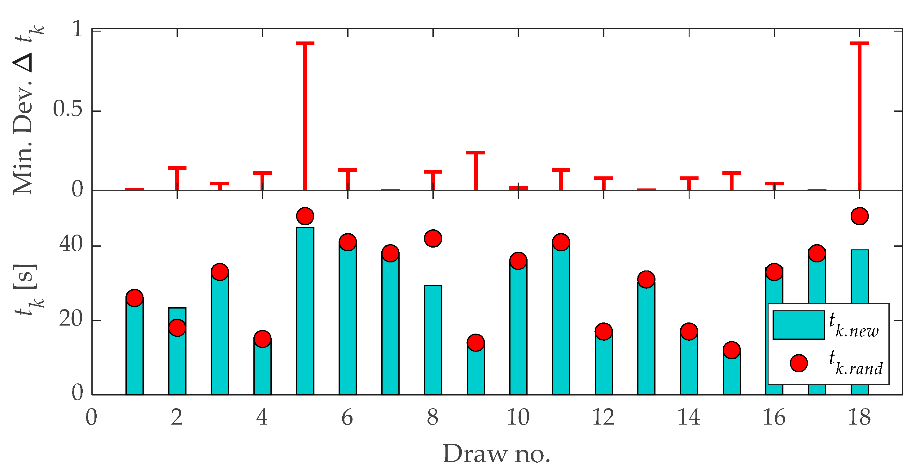 Draw No. | Input to Stage 4 (C): tk.rand [s] | Stage 1 Result (D): tk.new [s] | Percent Error (C−D) [%] | Absolute Error (C−D) [s] | Min. Dev. of Δtk [s] |