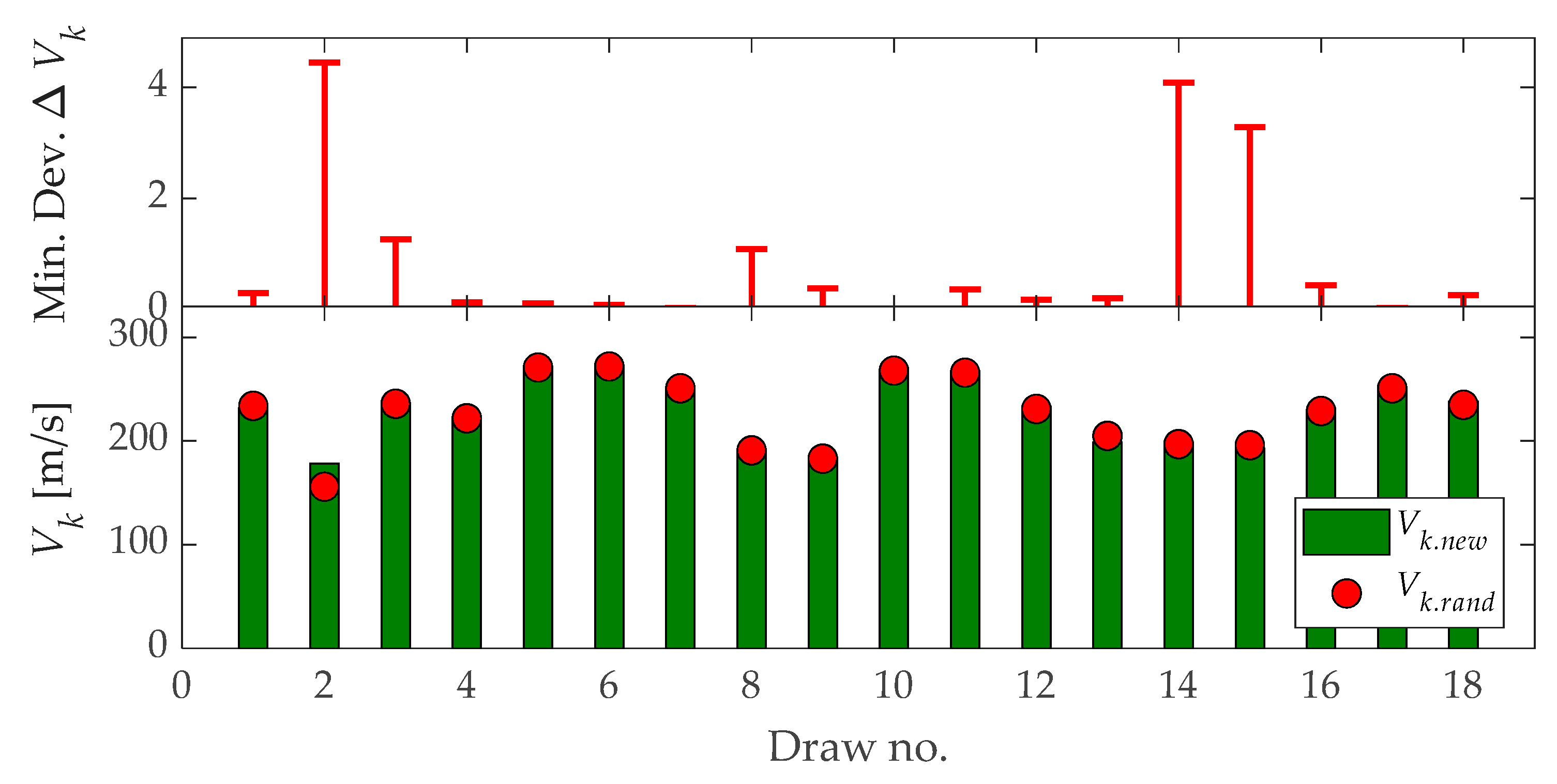 Draw No. | Input to Stage 4 (C): Vk.rand [m/s] | Stage 1 Result (D): Vk.new [m/s] | Percent Error (C−D) [%] | Absolute Error (C−D) [m/s] | Min. Dev. of ΔVk [m/s] |