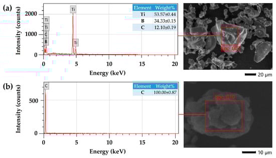 The elemental composition of the reinforcing materials was analyzed by energy-dispersive spectroscopy (EDS, JSM-IT200 microscope, Jeol Ltd., Tokyo, Japan). The EDS spectrum of TiB2 (Figure 2a) confirmed the presence of titanium (Ti) and boron (B), whereas the spectrum of MWCNTs (Figure 2b) showed exclusively carbon (C), indicating high purity and absence of detectable impurities.