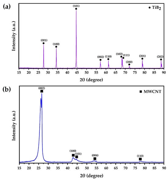 The XRD pattern of MWCNTs, presented in Figure 3b, exhibits characteristic diffraction peaks at 2θ ≈ 26.14° (002), 42.82° (100), 44.46° (101), 53.91° (004), and 77.81° (110), typical of graphite-like carbon (JCPDS card No. 96-101-1061) [,]. The most prominent peak at 2θ ≈ 26.14°, corresponding to the (002) plane, reflects the interlayer spacing of the graphite-like layers, confirming the multi-walled structure of the nanotubes. Other reflections are considerably weaker. Compared to TiB2, the MWCNT peaks are broader and less intense, reflecting their nanoscale dimensions and the presence of structural defects.