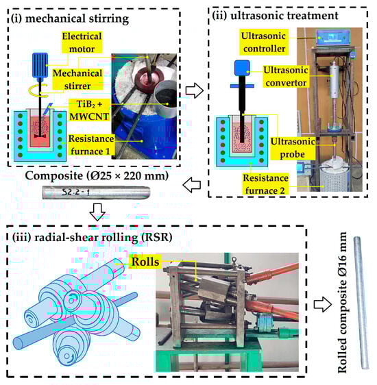 The materials listed in Table 2 were fabricated using a multi-stage process comprising three sequential steps: (i) mechanical stirring, involving the initial blending of TiB2 and MWCNT particles in molten aluminum; (ii) ultrasonic treatment, applied to achieve uniform particle dispersion and to deagglomerate TiB2 and MWCNT within the melt; and (iii) radial-shear rolling (RSR), employed for additional strengthening through grain refinement and densification of the particle distribution within the matrix. These steps are schematically presented in Figure 4.