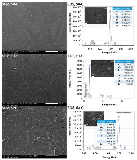 SEM images and EDS spectra of the as-cast samples S0–C, S1–C, and S2–C are presented in Figure 5.