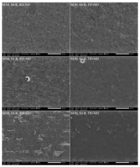 SEM images of samples S0-R, S1-R, and S2-R after RSR in the RD–ND and TD–ND planes.