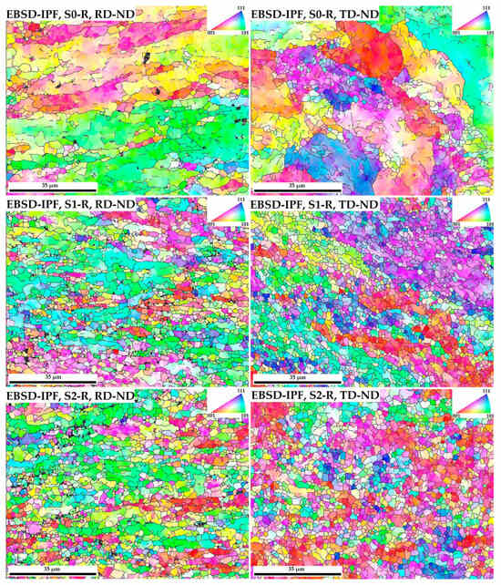 To gain deeper insight into the microstructural evolution induced by RSR, EBSD analyses were conducted on samples S0-R, S1-R, and S2-R in two orthogonal planes: RD–ND and TD–ND. The results are shown as Inverse Pole Figure (IPF) maps, with colors representing the orientation of individual grains relative to the ND (Figure 7).