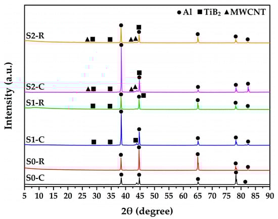 The hybrid composites containing MWCNTs (S2-C and S2-R) exhibit, in addition to aluminum and TiB2 peaks, a weak but distinct broad peak at 2θ ≈ 26.1°, corresponding to the (002) interlayer diffraction of graphite-like carbon (JCPDS card No. 96-101-1061). This feature directly confirms the presence of MWCNTs after casting and RSR. The peak’s increased full width at half maximum (FWHM) reflects the nanoscale dimensions of the carbon nanotubes and the presence of structural defects.