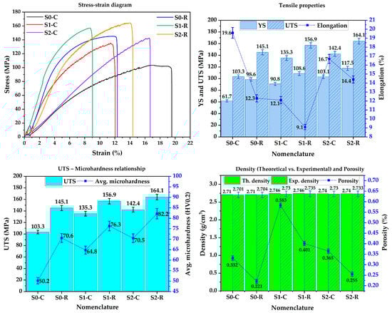 Figure 9 summarizes the mechanical performance of all sample series. In the as-cast condition (S0-C), both yield strength (YS) and ultimate tensile strength (UTS) were minimal, characteristic of cast aluminum alloys without thermal or mechanical treatment.