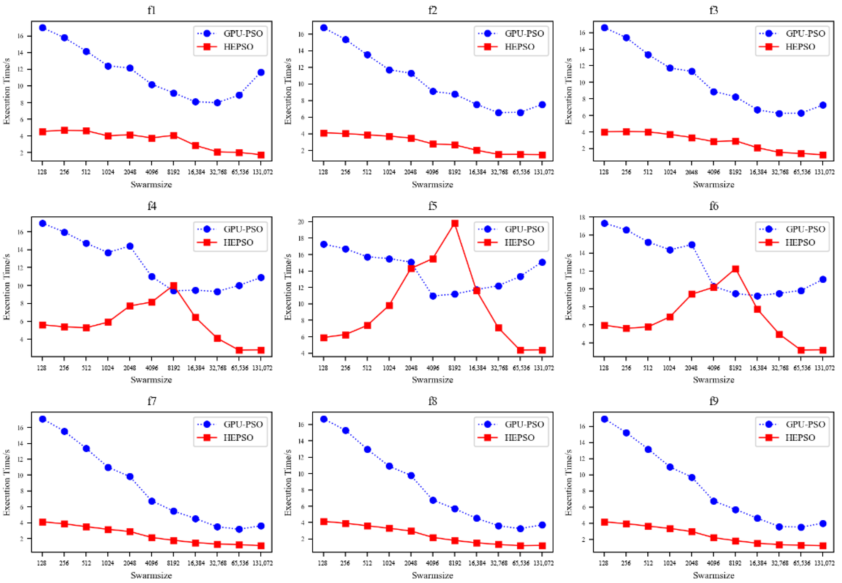 21] proposed a variational PSO algorithm that accelerates convergence speed by evolving particles in a beneficial direction. Using several benchmark functions, they demonstrated that their variant PSO algorithm has an improved running speed, achieving a speedup of at least 25 times after GPU acceleration with larger population sizes. Cai Yong et al. [