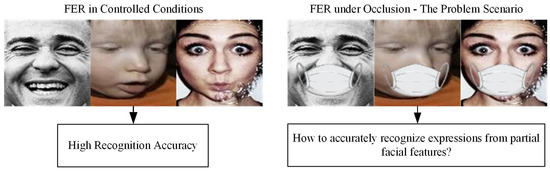 The challenge of Facial Expression Recognition (FER) under occlusion.