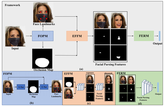 A study that considered face masks in FER focused solely on recognizing emotions from the eye region, evaluating this method on the mask-aware FER-2013 dataset, which encompasses seven distinct emotions [28]. However, this approach neglects other crucial facial areas, such as the forehead, when isolating the eye region using landmark detection methods, thereby reducing the accuracy of the FER system. We have observed that existing landmark detection tools, including Openface2.0 [29], which is utilized in current studies, are less accurate when dealing with facial images that include face masks, further diminishing the detection accuracy of the FER system [30,31,32]. Although some studies have attempted to address the robustness of landmark detection, there remain unresolved issues: there is still a significant gap in landmark detection accuracy between masked and unmasked faces, and the landmarks can only roughly differentiate between the covered and uncovered facial regions.