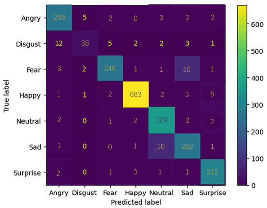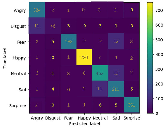 Figure 4 and Figure 5 show the confusion matrices of our model on the RAF-DB and FER+ datasets, respectively [42]. The following discussion can be derived from these results: