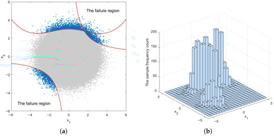For this performance function, the direct MCS is first used to sample the failure domain. As shown in Figure 4, out of total samples, 3473 points fall into the failure domain, comprising only 0.3473% of the total. Although MCS sampling is inefficient, it provides a relatively accurate estimate of .