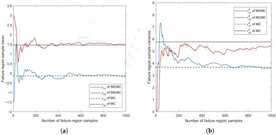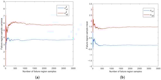 Figure 5 displays the evolution of the mean and variance of failure domain samples in the and directions with increasing sample size.