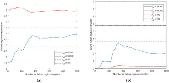 From Figure 5, the mean and variance of the failure domain samples in the and directions stabilize at , , , and . These MCS results serve as a benchmark for evaluating other sampling methods.