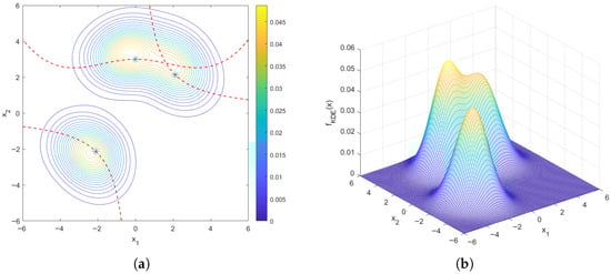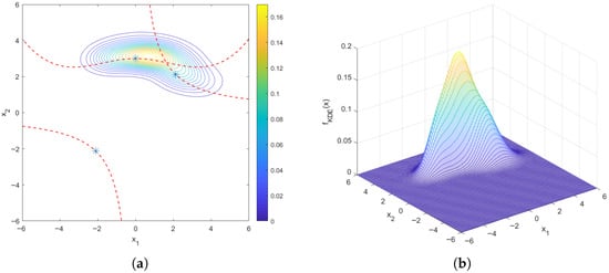 Under two-dimensional conditions, illustrations of the proposal distributions from Equations (4) and (5) are provided in Figure 1a,b.