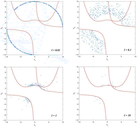 In the proposal distribution function shown in Equation (5), the parameter l controls the radial jump capability of IMCMC. As shown in Figure 12, for the performance function shown in Equation (15), under the same initial state point (0, 10) and sampling count (1000 times) conditions, the samples obtained by IMCMC are significantly different when parameter l takes different values. This has a direct impact on the subsequent failure probability calculation.