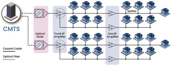 An HFC network is typically divided into two main sections: (i) the optical segment, which connects the central office to nodes via fiber optics, and (ii) the coaxial segment, which employs line amplifiers and splitters to deliver service to end users. Signals originate at the master headend and pass through the Cable Modem Termination System (CMTS) before reaching optical nodes, where they are converted to Radio Frequency (RF) for coaxial transmission [12]. This architecture facilitates fault detection, particularly within the segment between the CMTS and the optical nodes.