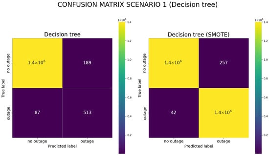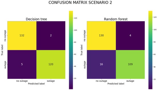The test sets set aside during preprocessing were used to assess performance, and confusion matrices were generated for both Scenario 1 and Scenario 2. In Figure 5 and Figure 6, the left panel shows the confusion matrix for the Decision Tree model, while the right panel presents the results for the Random Forest model. Figure 7 displays the confusion matrices for both models when classifying events as “outage” or “no outage.” Each matrix is color-coded to represent true positives, false positives, false negatives, and true negatives.
