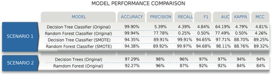 Performance metrics of Decision Tree and Random Forest classifiers on original and SMOTE-enhanced datasets, including accuracy, precision, recall, F1-score, AUC, Cohen’s Kappa, and MCC to assess classification under class imbalance.