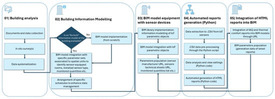 The proposed workflow, although adopting a static approach in data management, was designed to be easily extendable to a dynamic system in the future by fully automating report generation and updates based on dynamic real-time data. This static approach may be considered, in fact, the main novelty introduced by the proposed methodology, as even though real-time data are not definitely stored in the BIM model, the latter provides a reliable decision support basis anyhow, thanks to the integrated and constantly updated reports on IEQ conditions of the monitored rooms. It is also worth specifying that the proposed final reports not only summarize collected data from IoT devices referred to a specific time span but also include intuitive comparisons among the acquired values and related reference thresholds from international standards to ease data interpretation and enable a prompt detection of potential critical issues to face, thus lending additional novelty to the presented approach.