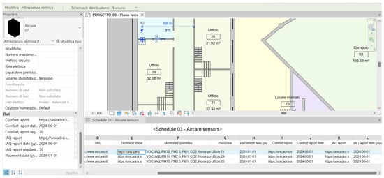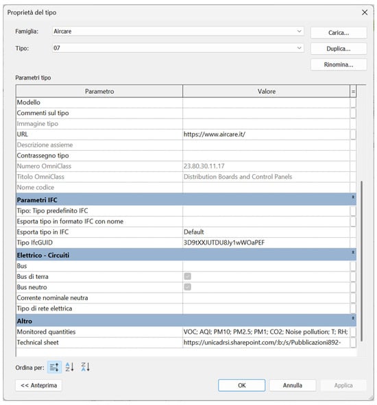 - Tailored parameters to collect relevant information concerning installed sensors and related quantities to monitor, according to the proposed methodology (see Section 2.2 and Section 2.3), mainly associated with BIM spatial units (i.e., rooms) but also directly integrated in the parametric virtual prototypes of sensor devices;