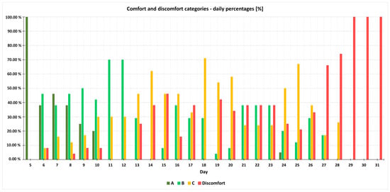 - Comfort summary histograms: Histograms are included in the report to schematically represent the overall percentages of time in which the monitored environmental conditions were classified as “optimal”, “good”, or “poor”, respectively. This summary allows for a prompt assessment of the overall effectiveness of the adopted environmental management strategies.