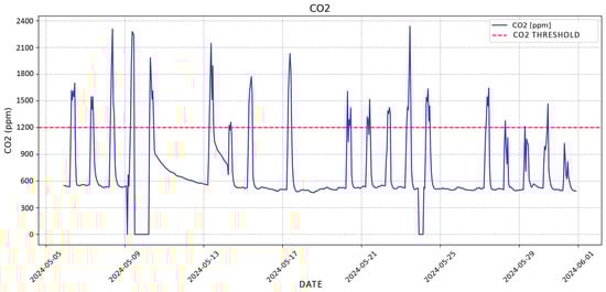 - Data analysis and view settings: This second portion of the Python algorithm is devoted to more advanced processing operations on the collected data in order to extract meaningful information. More specifically, the average values of the assessed environmental parameters are calculated, potential anomalous peaks in the related trends are identified, and descriptive statistics are then generated for each parameter. Moreover, the data analysis herein considered also includes a comparison of the analyzed indicators with corresponding regulatory thresholds defined by recognized international standards [24,25,26]. The Python code then allows for a graphical representation of results (see Figure 4 and Figure 5) that emerged from the data analysis, to facilitate their understanding and interpretation. For that purpose, different types of graphs are used. In addition, the algorithm performs various kinds of controls to ensure that data visualizations are clear and accessible, by also taking advantage of labels and legends to better explain the meaning of each parameter and visually represent the critical thresholds. The main goal of the considered view settings is to allow both specialized and common users to easily understand the final results to make informed and aware decisions.