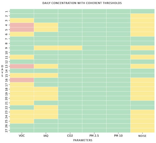 Heatmap of IAQ indicators’ daily values categorized based on the related adherence level to consistency thresholds (green = excellent, yellow = good, red = low).