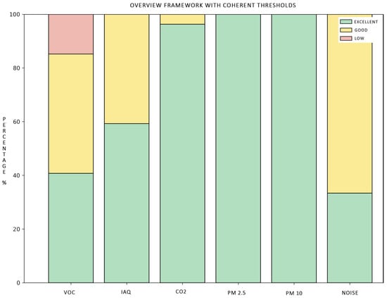Moreover, the final summary chart in Figure 17 reports, for each IAQ indicator, the overall percentages of adherence to the considered reference ranges, thus enabling an easy detection of critical parameters that may compromise IAQ in a specific space.
