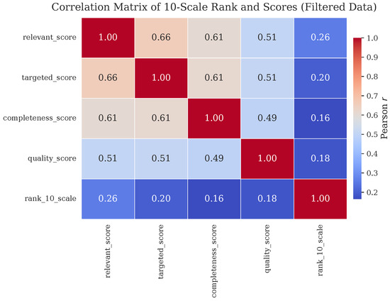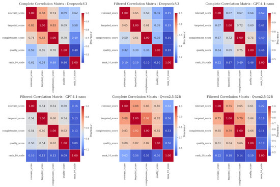 Correlation matrix between model scores and expert evaluation scores (filtered data).