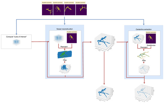At this point, the algorithm can be terminated and the vessel point cloud returned. Otherwise, the reconstructed vessel is forwarded to centerline extraction. In this part, the point cloud from the previous step is projected onto the images via Equation (8); however, at this point, the segmented vessel is thinned using Guo–Hall algorithm [31], which produces a skeleton or a centerline of the arteries.