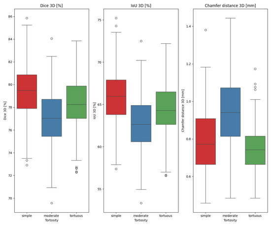 Performance: 3D metrics for three vessel tortuosities supported by the generator.