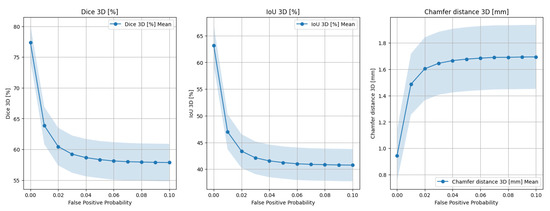 Performance: 3D metrics with respect to false positive occurrence probability, blue shades mark the area within one standard deviation.
