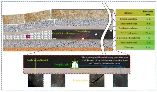 Since the launch of the 14th Five-Year Plan, China’s coal industry has continued to serve as the nation’s energy security “ballast stone.” As the core component of China’s coal reserves, thick and ultra-thick coal seams are currently the primary targets for achieving high-yield and high-efficiency mining operations []. Compared to traditional rock roadway development, the coal roadway system has emerged as the predominant technical approach for efficiently exploiting extra-thick coal seams due to its significant advantages in resource utilization, mining efficiency, and economic benefits. However, geological factors, notably the considerable thickness and deep burial of these coal bodies, lead to a more complex stress field distribution in extra-thick seams compared to conventional ones []. Consequently, controlling roadways’ surrounding rock becomes increasingly challenging. This challenge is exacerbated by the trend of reducing coal pillar widths. Roadways are often situated within high-stress concentration zones and subjected to significant asymmetric loading effects, intensifying surrounding rock damage and thereby increasing maintenance difficulties and mining risks.