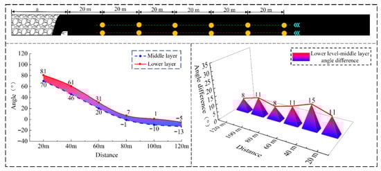 (2) Spatial disparity in layer angle difference: The difference in α between the upper and lower layers is the most significant, reaching a maximum of 34°. This value substantially exceeds the differences observed between the upper-middle layers and the middle-lower layers. Furthermore, the variation in α difference between the middle and lower layers is more gradual compared to that between the upper and lower layers. Consequently, special attention to surrounding rock control is warranted for the lower roadway in engineering practice. The peak difference in α occurs at the 40 m measuring point, signifying this location as the area of most significant layer effect.