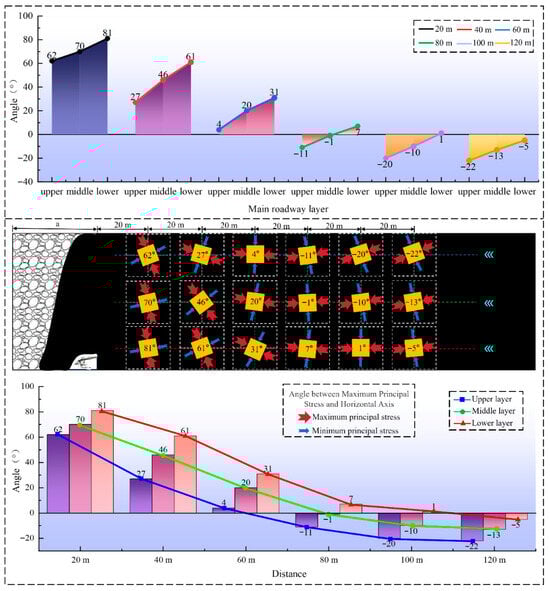 To investigate the stress evolution during the systematic reduction in the pillar width from 120 m to 20 m, three-dimensional stress component data for the surrounding rock at different layers were extracted using the established 3D numerical model. The principal stress directions at each monitoring point within the main roadway of the extra-thick coal seam were derived from stress component calculations. Six strategically positioned measuring points per layer, located at distances ranging from 120 m to 20 m ahead of the advancing working face, were selected to analyze the principal stress direction variation. The reorientation magnitude of the maximum principal stress trajectory relative to a prescribed layer datum quantifies maximum principal stress (σ1) deflection. Relative to the stratigraphic axis, clockwise rotation of the σ1 trajectory is designated positive (“+”α), while counterclockwise deflection carries negative polarity (“−”α). The principal stress variations at these measuring points relative to the working face position, when the roadway is situated at different layers within the coal seam, are presented in Figure 3.